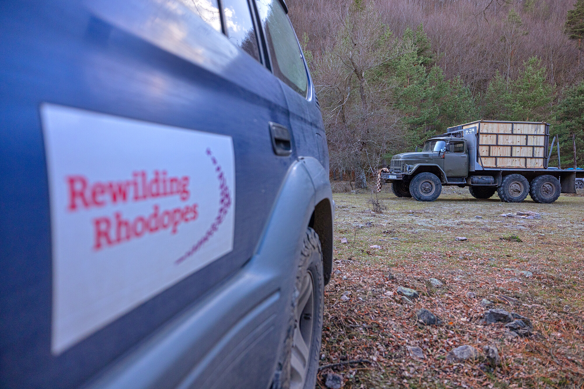 The bison of Zhenda share their habitat with an impressive array of wildlife, including wolves, brown bears, jackals, red deer, roe deer, chamois, and a wide variety of birds. To help visitors explore this remarkable biodiversity and connect more deeply with nature, the Rewilding Rhodopes team is partnering with a local tourism agency to create a network of eco-trails. Along these routes, strategically placed signs will highlight rewilding efforts and the many species that call the landscape home. A former hunting hide, acquired from a local forestry unit, is currently being renovated and will soon be ready to welcome visitors.