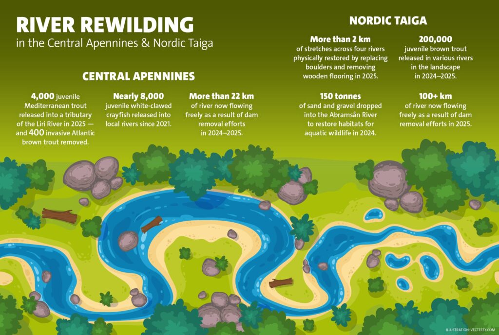 In many of its operational landscapes — from the Central Apennines to the Nordic Taiga and beyond — Rewilding Europe and its partners are giving rivers a helping hand to heal. The ultimate goal is for vibrant rivers to manage themselves — with dynamic natural processes renewing old habitats, creating new ones, and supporting abundant wildlife. To find out more about how you can support river rewilding, visit our Rewilding Rivers page.